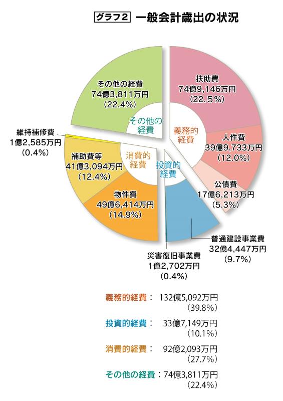 義務的経費は、132億5,092万円で、全体の39.8パーセントを占め、令和4年度に比べて0.5パーセント増加しました。このうち人件費は39億9,733万円で、令和4年度に比べて0.9パーセント減少しました。