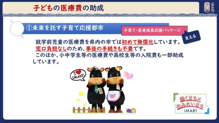 伊万里市では、子育て・若者成長応援パッケージとして、医療費や保育料などの経済的な支援のほか、子育てや教育環境の整備などについて、「支える」「感じる」「選ばれる」の3つの視点から支援策を組み合わせて推進しています。
