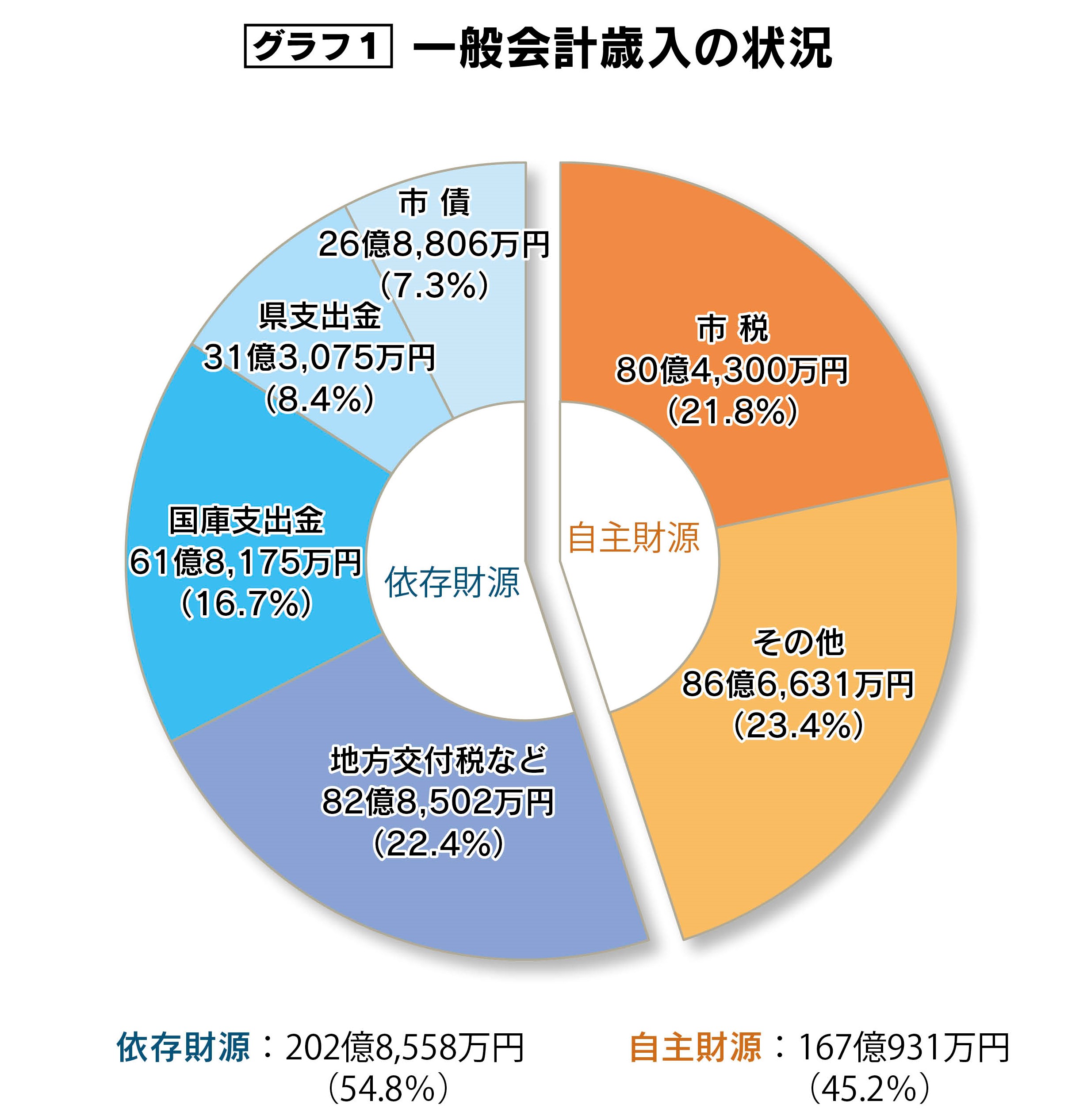 自主財源の総額は、167億931万円で、全体の45.2パーセントを占め、令和5年度に比べて7.3パーセント増加しました。このうち市税が80億4,300万円で、令和5年度に比べて0.7パーセント増加し、その他のうち寄附金は27億6,008万円で、令和5年度に比べて14.2パーセントの増加となっています。
