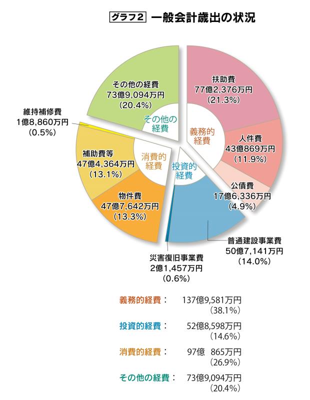 このほか、学校教育や社会教育などの『教育費』に約47億円、生活環境整備などの『衛生費』に約21億円、道路や河川、公園整備などの『土木費』に約19億円、借入金の元利償還金に充てる『公債費』に約18億円を支出しました。