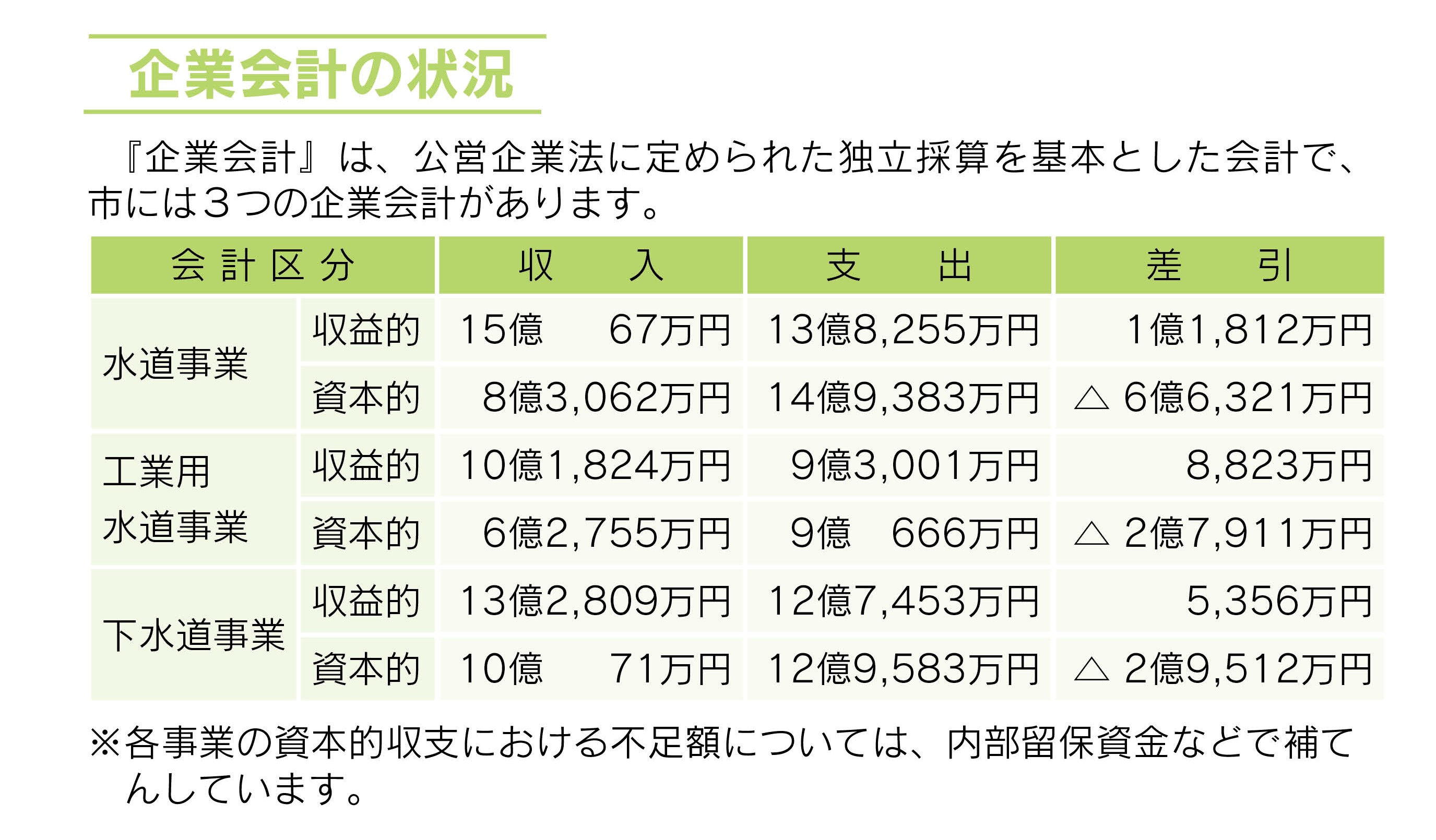 安心して飲める水道水の安定供給のための水道事業特別会計、企業活動に欠かせない工業用水の供給のための工業用水道事業特別会計、快適な生活環境の確保のための下水道事業の3つの企業会計を設置しています。下表はそれらの決算の状況です。水道使用料などの収入をもとに、独立採算で経営しています。
