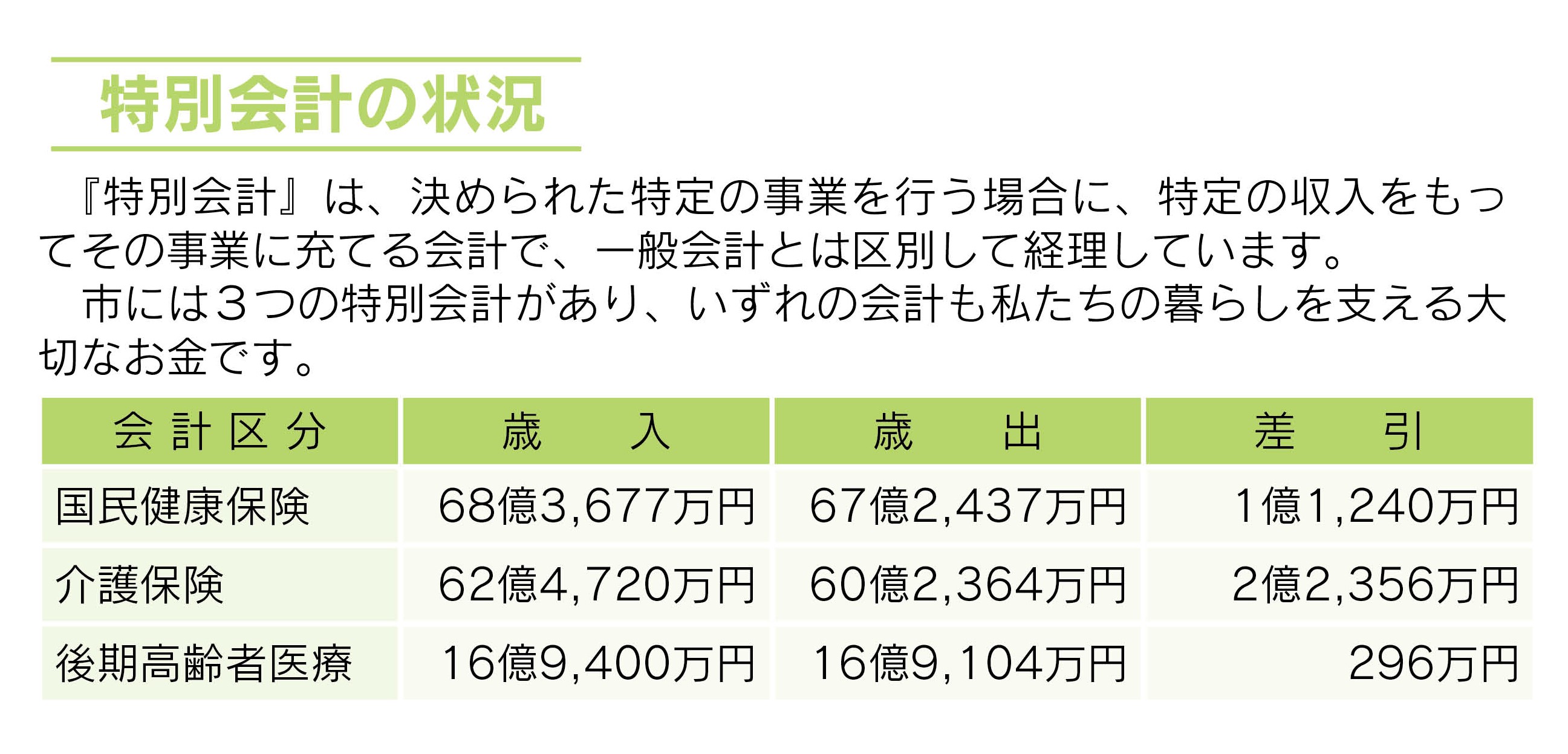 皆さんの税金をはじめ、国、県からの補助金や交付金などを財源として、福祉、教育、土木、農林水産など、皆さんにいちばん身近な事業を行っているのが『一般会計』です。