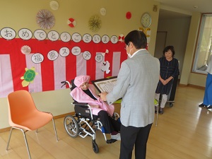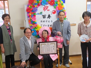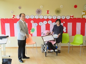 ●令和 7年 9月29日(月) 百寿記念品贈呈 百歳の誕生日を迎えられた福原スエ子さん(東山代町)を訪問し、百寿記念品として長寿を祝う図柄が描かれた伊万里焼の飾り皿を贈り、長寿をお祝いしました。