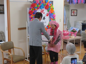 ●令和 7年10月 3日(金) 百寿記念品贈呈 百歳の誕生日を迎えられた川本和子さん(新天町)を訪問し、百寿記念品として長寿を祝う図柄が描かれた伊万里焼の飾り皿を贈り、長寿をお祝いしました。