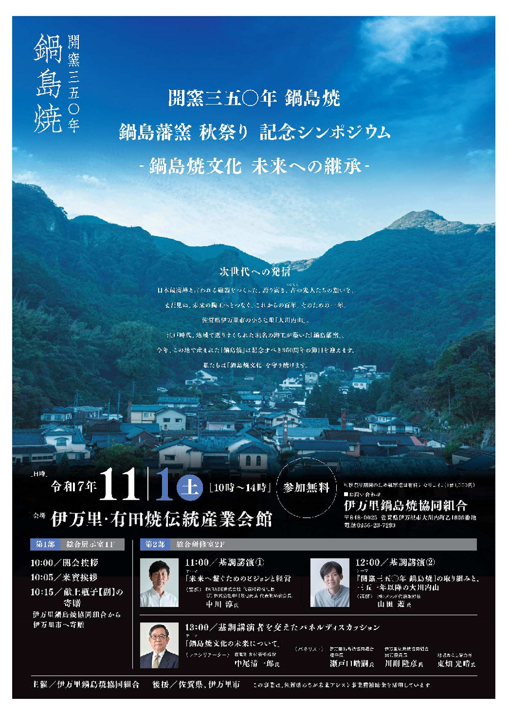 今年で350年の節目を迎える鍋島焼。鍋島藩窯秋祭り期間中に記念シンポジウムが開催されます。これまでの鍋島焼の歴史を学び、未来の鍋島焼を考えるきっかけになれば幸いです。