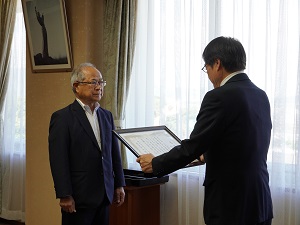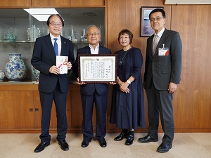 ●令和 7年10月 9日(木) 市長感謝状贈呈 市内中学校の教育及び市民図書館の充実・振興に役立ててほしいと、福岡県春日市の北田織様(国見中学校出身、春日市議会議員)より教育振興奨励基金へ500万円が寄付され、感謝状を贈呈しました。