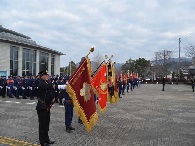 年頭にあたり、消防団員の士気高揚を図ることで、市民の皆様が安全で安心して暮らせるまちづくりを推進するとともに、職務遂行への決意を新たにするため開催するものです。