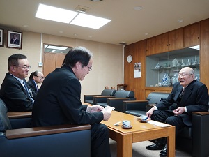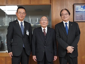●令和 7年12月11日(木) 叙勲受章報告 長年にわたり選挙管理委員会委員として公明かつ適正な選挙の執行及び啓発等に尽力され、秋の叙勲で旭日単光章を受章された、元選挙管理委員会委員長の岩永孝雄氏(南波多町)が、市長に喜びの報告をされました。