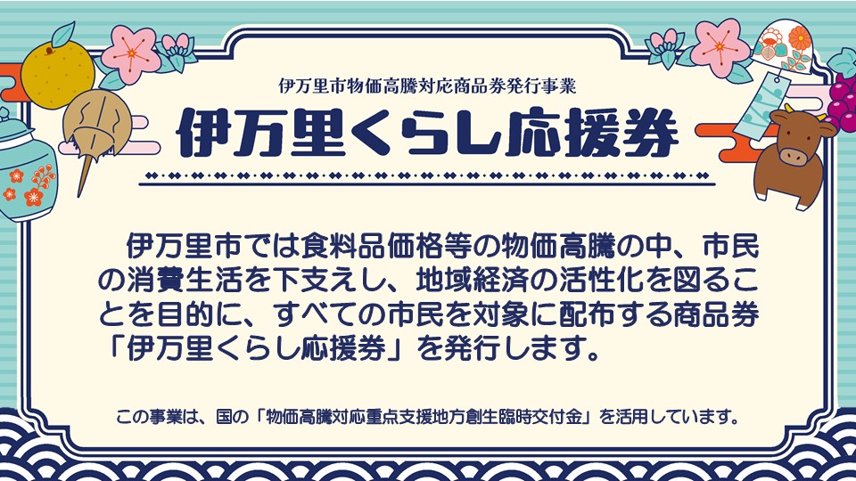 市では食料品価格等の物価高騰の中、市民の消費生活を下支えし、地域経済の活性化を図ることを目的に、すべての市民を対象に配布する商品券「伊万里くらし応援券」を発行します。
