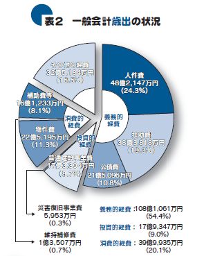 このうち義務的経費は108億1,061万円で、全体の54.4%を占めていて、平成16年度に比べて7.9%の減少になっています。うち人件費は48億2,147万円で、平成16年度に比べて1.4%の減少となっています。