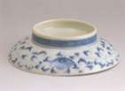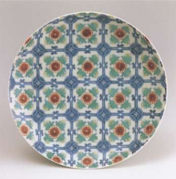 初期の鍋島に多い更紗文の皿です。七宝文を角に配して四角い区画を染付で描き、その中に赤・黄・緑の上絵を用いて菊花文を施しています。器面全体を覆う文様でありながら、明るく軽快な印象を与えるのは、染付と緑色の明るい色調が大部分を占め、愛らしい菊花の規則的なデザインのためでしょう。