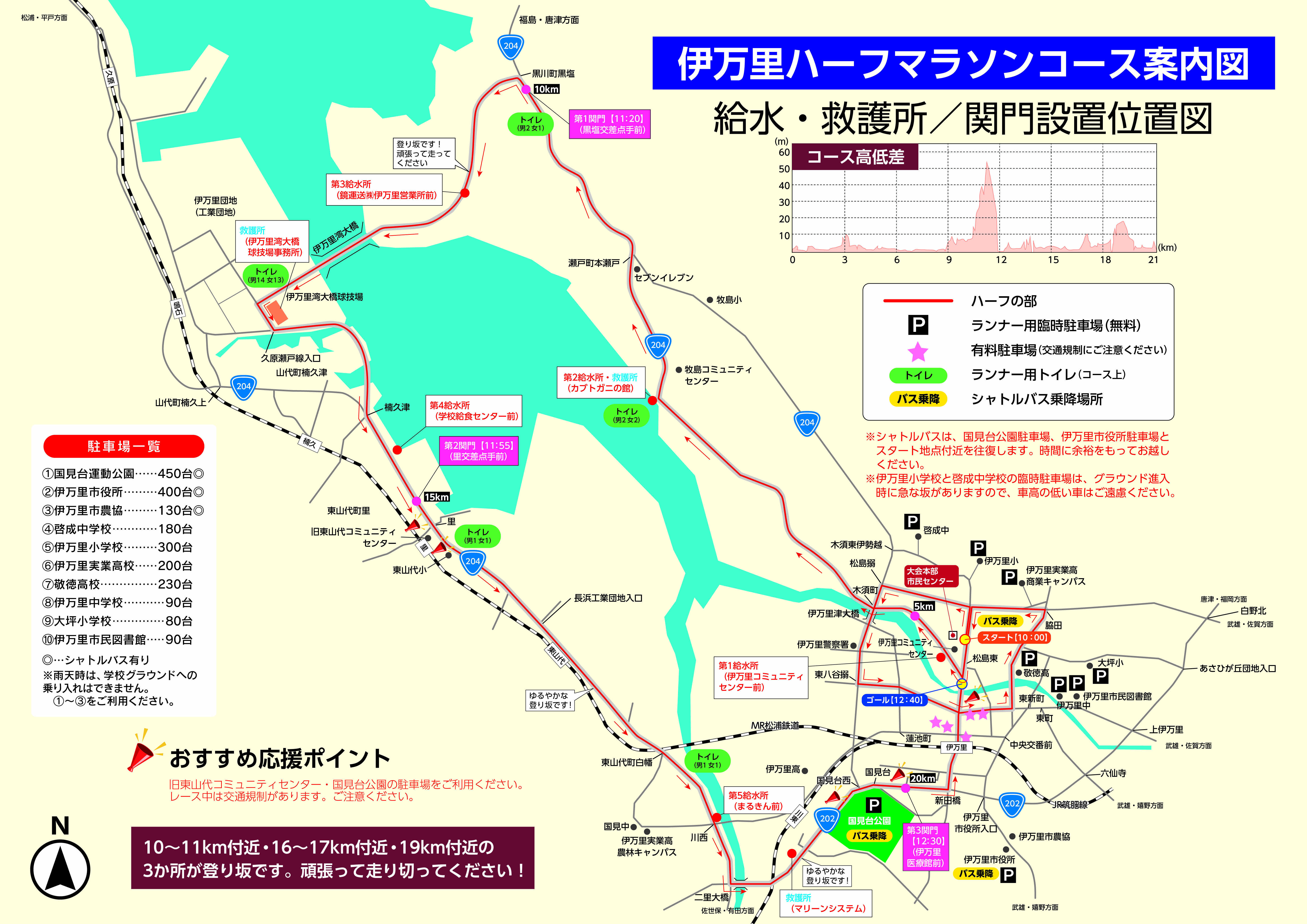 伊万里ハーフマラソンでは、コース上に給水所5ヶ所、救護所3ヶ所(本部を除く)を設置いたします。参考にご覧ください。