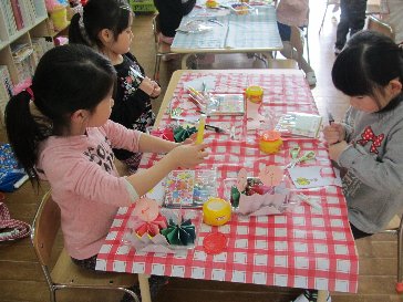 ゆり組は、作ったおひなさまに、飾り付けをしています。