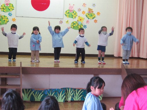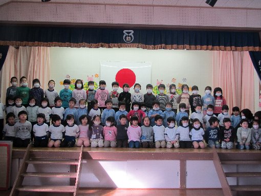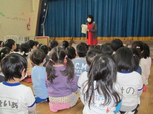 2月2日(月)全体の集会の時に、話がありました。園長先生は定例部課長会に出張されたので、井元先生が話されました。インフルエンザが市内小中学校で流行しているので、流行拡大を防ぐため、マスクをして登園するようにはなされました。また、手洗い、うがいをしっかりしようと話され、子ども達は真剣に聞いていました。さっそく次の日からマスクをして登園するようになりました。