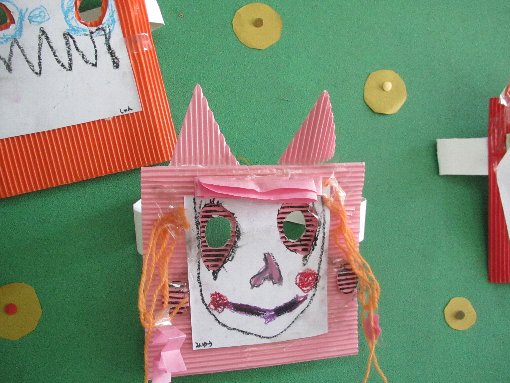 4歳児さくら組の鬼のお面です。毛糸や段ボールを使って、面白いお面が出来上がっていました。