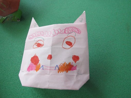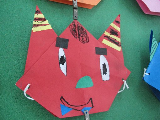 5歳児ゆり組さんのお面です。色画用紙で鬼を折りました。色紙を切って貼ったり、クレパスで色を塗って作りました。怖い鬼が出来上がりましたね。