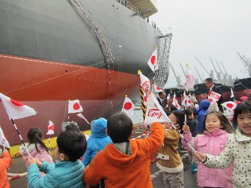 名村造船所の進水式に、年長組と年中組が行きました。