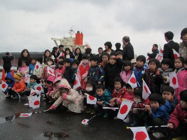 「いってらっしゃーい」と、子供たちは、手や旗を力いっぱ