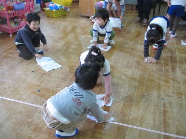年中さんも道具棚拭きをがんばっています。