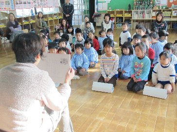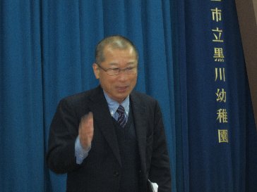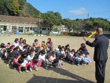 全体の集まりでの園長先生のお話は、寒さに負けないよう