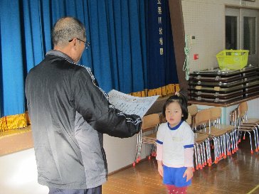 住友生命の絵画展で 秀作賞 に入り園長先生から賞状を