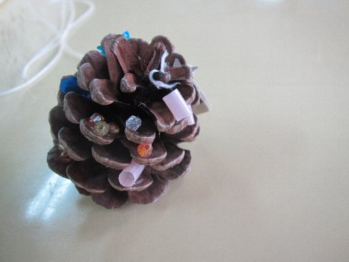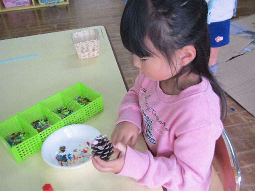 さくら組のクラスではマツボックリに、ビーズやポンポンなどをボンドでつけて、
