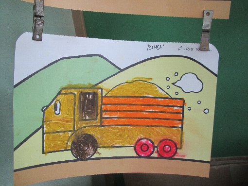 もも組さんはトラックの色塗りをしました。上手に可愛く塗れていますね。