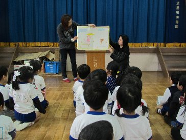 ぶっくんのお姉さんと、お話キャラバンさんが読み聞かせをしに