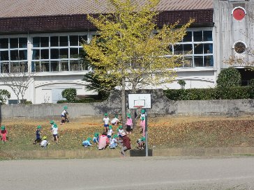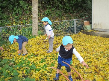 幼稚園の銀杏の木も色づき、落ち葉遊びを楽しんでいます。
