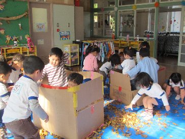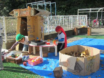 黒川小1年生との交流で一緒に作った段ボールの家を使って