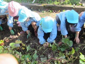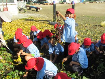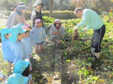 子どもたちは、園長先生から、芋の掘り方を教えてもらいました。