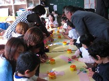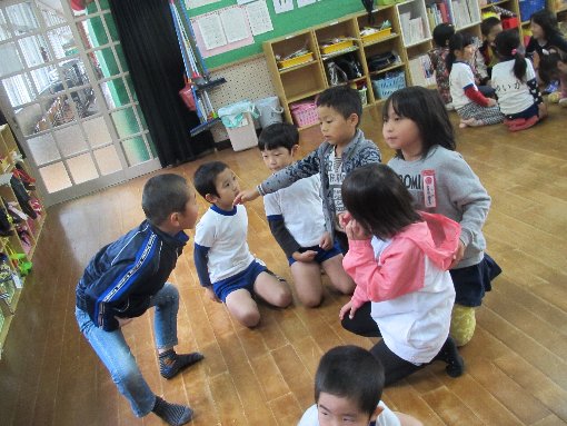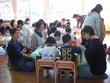 7グループに分かれて、話し合いをしました。昨年までゆり組だった小学生もいて、在園児がなつかしそうに話しかけていました。