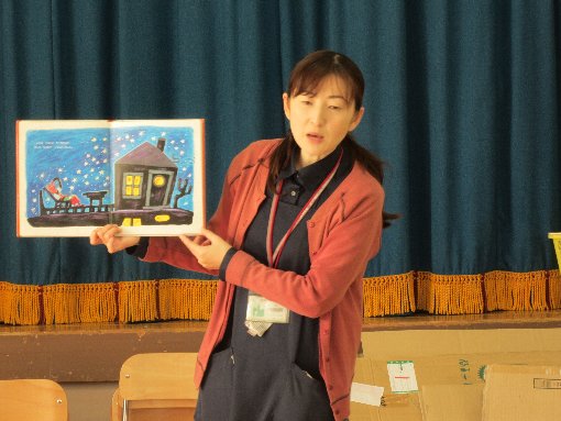 ぶっくんのお姉さんと、お話キャラバンさんが読み聞かせをしに