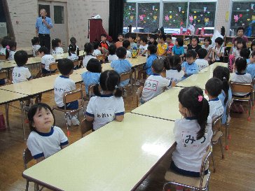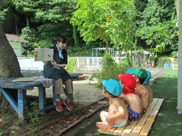 預かり保育の子どもたちが、木陰でお話を聞きました。