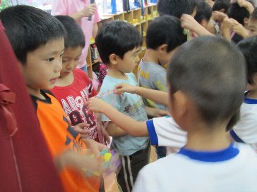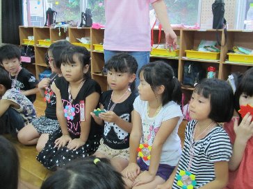 年長児から、カレー会に来てくれた1年生に手作りペンダントの