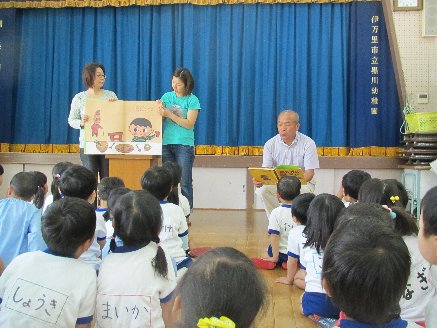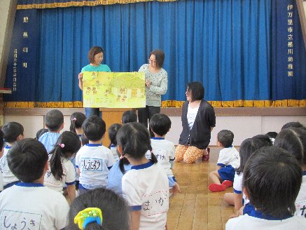 次に「ねずみのでんしゃ」の大型絵本を読んでくださいました。大きな絵で