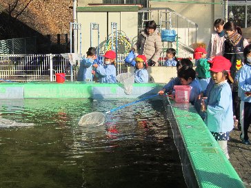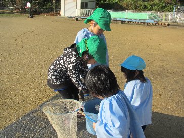 手を伸ばしたり、網ですくって集めたりしてバケツやざるにたくさん集めました。