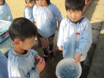 寒くても、泥団子を作って的当てをしたり、へびじゃんけんをしたりして元気に外で遊んでいます。