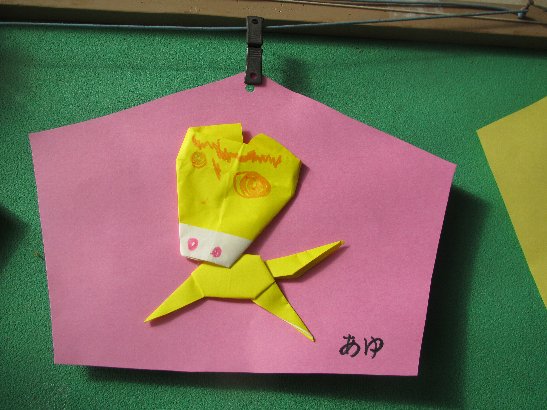 折り紙を貼りました。「馬」に、目・鼻・髪を上手に書いていました。