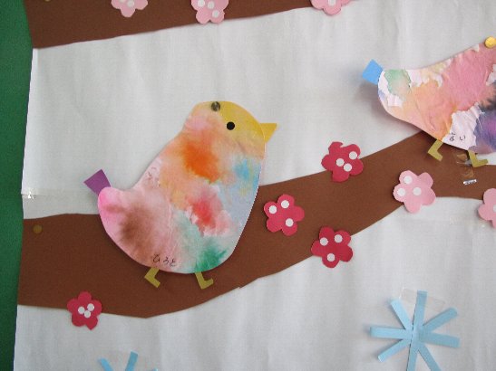 さくら組の壁面の小鳥です。これは、障子紙に水性マーカーで色を付け、