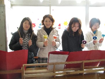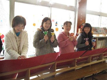 クリスマス会の出し物のハンドベルの練習を、お母さん方がにこやかにしてくださっています。