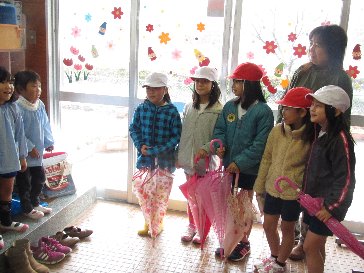 小学校の卒業式です。年長・年中児が見送りをしました。