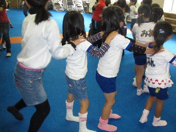 年長児はアルプス一万尺の手遊びをしたり、親子で
