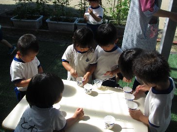 色水を作ったり、石鹸で泡を作ったりしてジュースや