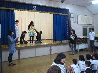 「家読のすすめ発表会」で、年長組が「ももたろう」の