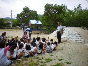 今回は不審者侵入ということで訓練しました。「ライオンが来ました」の話を聞き静かに訓練ができました。