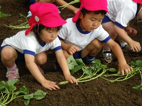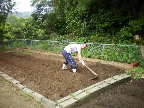年長児が野菜の苗植えをするために、畑作りをしています。