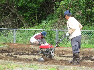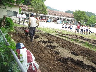 もうすぐ芋苗さし。畑の耕作を毎年してくださる園児のおじいちゃん(たかひとくんのおじいちゃん)が、今年もおばあちゃんと一緒に畑の耕作に来て下さいました。