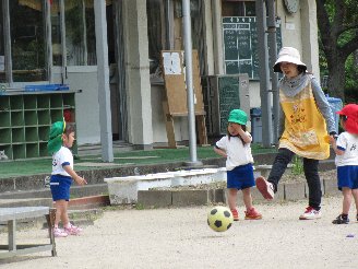 上・・・・年少組  先生と一緒にボール蹴りは楽し