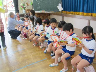 その後、園長先生からメダルのプレゼントを貰い、各クラスのお友達からもプレゼントをもらいました。